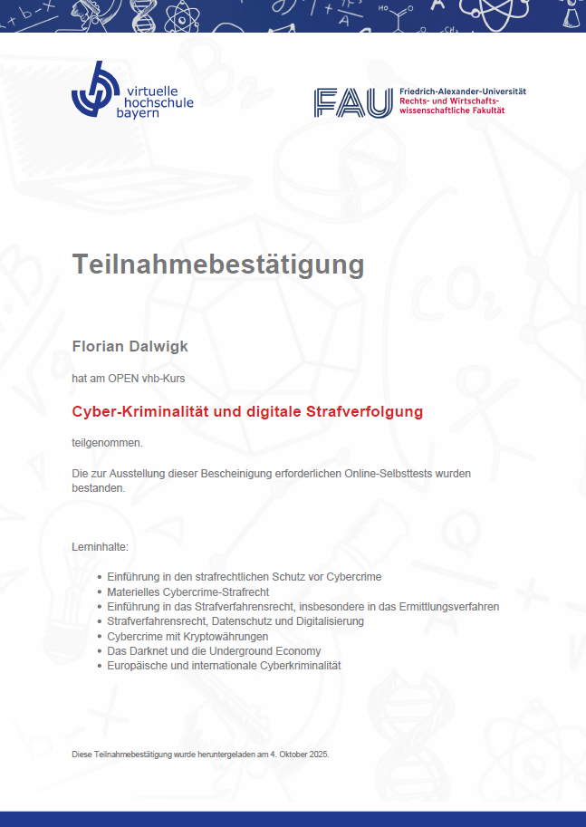 Ich arbeite als Fachbuchautor und unterrichte (pro Bono) an Hochschulen u. a. die Module Ethical Hacking, IT-Forensik und Cyberspionage.